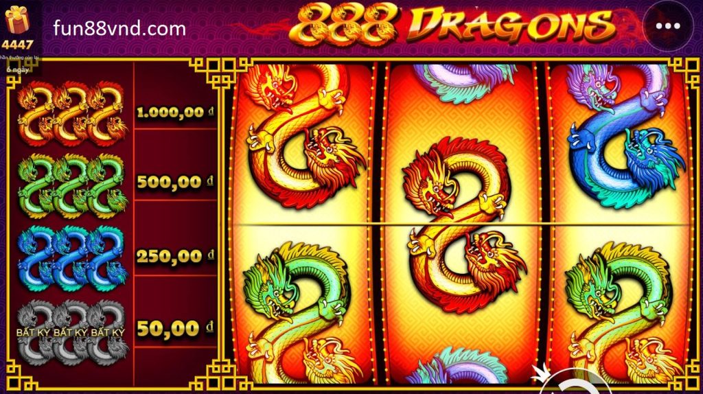 888 Dragon Fun88 là trò chơi máy đánh bạc 3 cuộn cổ điển, mỗi cuộn có biểu tượng con rồng và đường thẳng. Người chơi quay sao cho 3 con rồng xuất hiện trên cùng một hàng ngang.