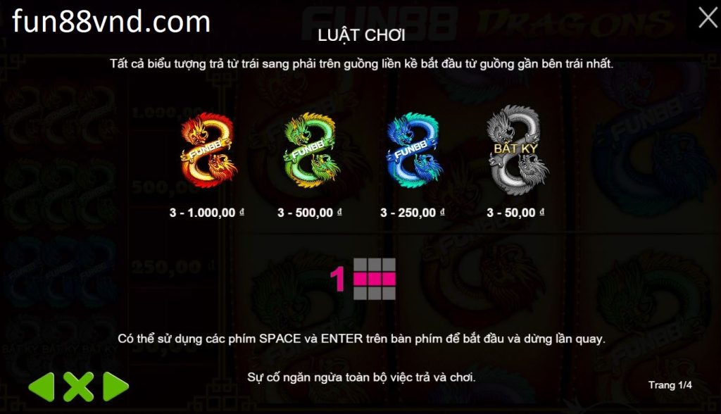 Fun88 Dragons là một trong những trò chơi casino trực tuyến đang được yêu thích tại Fun88 Slot. Đây là một trò chơi đơn giản nhưng hấp dẫn, với cách chơi đa dạng và nhiều cơ hội giành chiến thắng. Dưới đây là một số thông tin về trò chơi Fun88 Dragons :