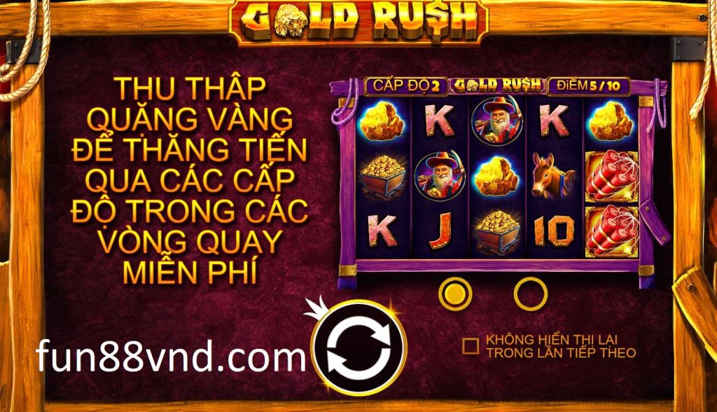 Cấp độ Gold Rush Fun88 càng cao thì quá trình quay miễn phí càng ngắn. Điều này sẽ cho phép bạn ngày càng nhận được nhiều giải thưởng lớn hơn và tuyệt vời hơn từ nhà cái. Với cấp độ cao nhất là Cấp độ 5, đây là cấp độ cao nhất và dễ chơi nhất. Khi đạt đến cấp độ 5, bạn sẽ nhận được một tổ hợp biểu tượng Wild và Gold Digger.
