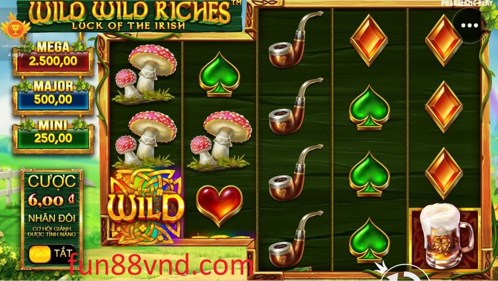 Kho Báu Vĩ Đại Fun88 là một sản phẩm đến từ Pragmatic Play house. Bạn có thể thấy chủ đề của trò chơi về Ireland. Nhưng với tất cả những cải tiến và nâng cấp mới. Thiết kế trò chơi sử dụng màu xanh lam làm màu chủ đạo. Vì vậy, nó rất bắt mắt và hấp dẫn. Các hình ảnh kết hợp như cầu vồng, cây nấm, đàn hạc, ống điếu,… được xác định trong trò chơi.
