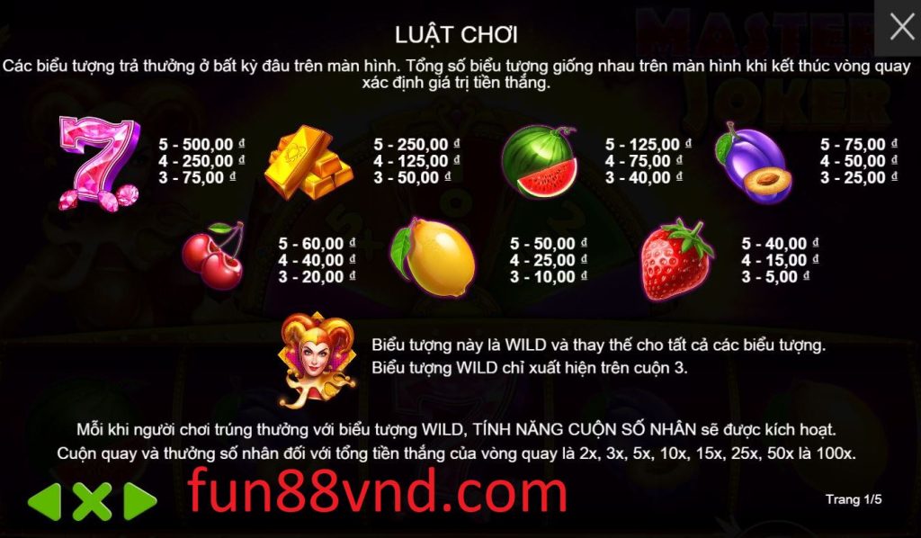Một điều đặc biệt ở game slot Master Joker Fun88 là người chơi phải đặt 3 biểu tượng giống nhau ở bất kỳ đâu trên một hàng thanh toán để giành chiến thắng. Mỗi biểu tượng mang lại cho người chơi biểu tượng wild miễn là bạn có từ 3 đến 5. Số 7 màu tím là biểu tượng có giá trị nhất. Tại đây, Fun88 Slot chúng tôi cung cấp cho người chơi khoản phải trả cho vị trí Master Joker: