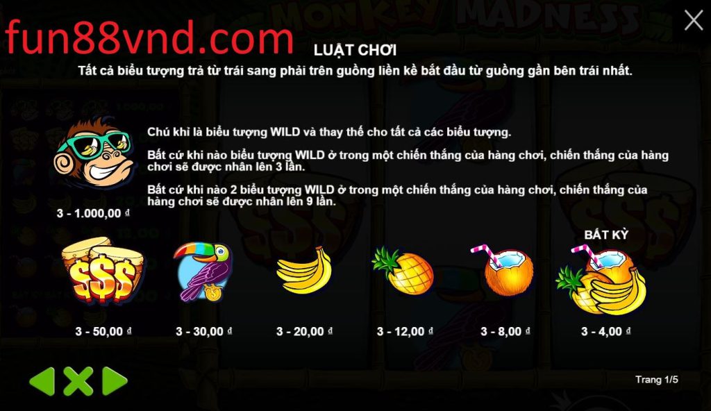 Trong trò chơi Monkey Madness Fun88, biểu tượng con khỉ là biểu tượng mạnh mẽ nhất. Khỉ thường được gọi bằng tên khác. Biểu tượng Wild Biểu tượng này thay thế cho bất kỳ biểu tượng nào khác trong trò chơi.
