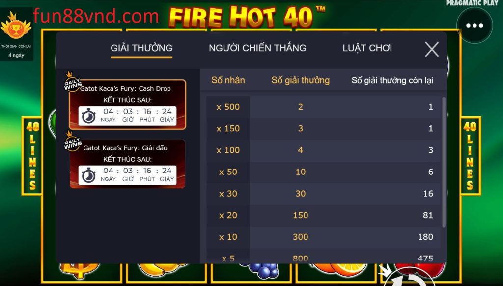 Trò chơi FUN88 SLOT GAME Ngọn Lửa Rực Cháy 40 Fun88 hay còn gọi là Fire Hot 40 có bố cục bao gồm 5 cuộn và lên đến 40 hàng thanh toán. Có thể dễ dàng nhận thấy rằng nó có chủ đề trái cây mang đến cho người chơi trải nghiệm thú vị.
