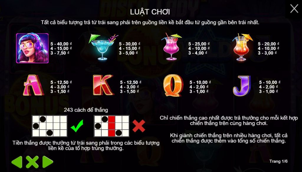 Quý Cô Disco Fun88 tại game slot khi bạn nhấn nút để bắt đầu quay Một sự sắp xếp ngẫu nhiên sẽ xảy ra. Nếu bạn may mắn có được một đường ngang có biểu tượng giống như vậy. Bạn sẽ thắng cược đó. đặc biệt các quy tắc tính toán phải được áp dụng từ trái sang phải trên các ký hiệu liền kề. Miễn là có 3 dòng trở lên có biểu tượng giống nhau thì người chơi sẽ thắng.