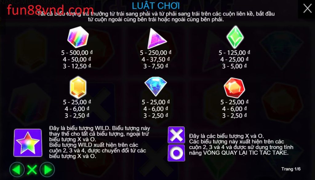 Tic Tac Take Fun88 Các biểu tượng X và O của Fun88 mang lại nhiều chiến thắng hơn bằng cách sử dụng các biểu tượng khác thay thế. Ngoại trừ ký hiệu X và O là 2 ký hiệu chính. Chúng có thể được sắp xếp trên các cuộn 2, 3 và 4, các cuộn này sẽ biến thành ký hiệu O và X.